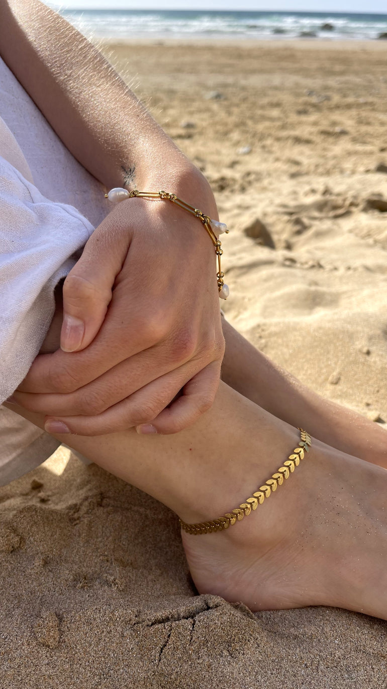 Materials: 18K Gold PVD on stainless steel, freshwater pearls.